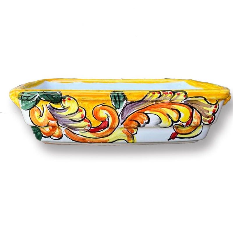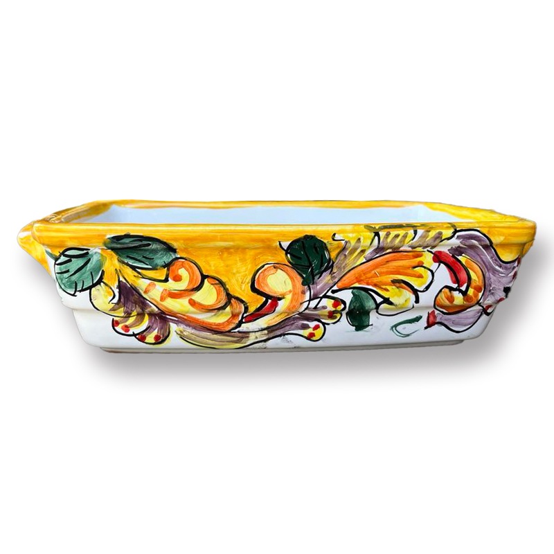 こんなタイプの陶器が欲しかった方も多いはず!かわいい絵柄でパーティーにも大活躍! 丈夫なのでオーブンにも対応◎ ラザニア以外にもグラタンや南イタリアの郷土料理ティエッラなど、 色んなお料理をお楽しみください♪ ※画像はイメージです※ 南イタリアの素朴な街で作られる陶器は、一枚、一枚、全て職人が手書きで仕上げ、磁器とは違い、低温で焼き上げております。 このため、柄の位置が違ったり、気泡が入ったり、色の出具合などが一つ一つ異なり、同じ商品であっても濃かったり薄い部分があるなど、個体差がございます。 それらも含め、偶然に発生する現象のすべてがやきものの味わいであり、魅力の一つです。 そのため画像はイメージになりますので、個体差はあらかじめご了承ください。 〇電子レンジ、食洗器のご利用はおすすめいたしません。 商品サイズ 22x14cm 深さ6cm